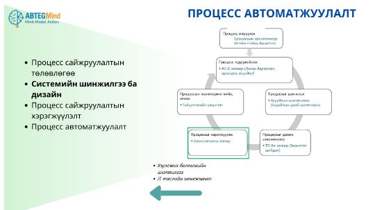 Байгууллагын үйл ажиллагааг менежментийн, үндсэн үйл ажиллагааны, дэмжих процессын бүхий л түвшинд сайжруулалт, автоматжуулалтыг хийж үр дүнгүй алхмуудыг хасах боломжийг олгоно.